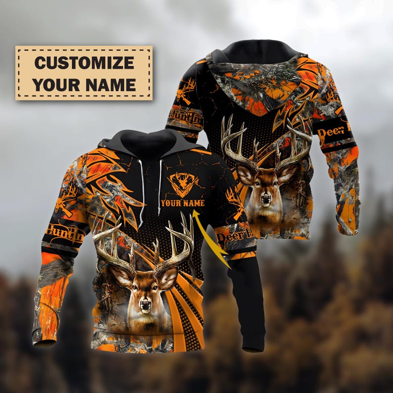 Custom Buck Hunting Hoodie in Blaze Camo, Personalized Deer Hunter Sweatshirt, 3D All Over Print Hunting Jacket for Men, Gift For Dad