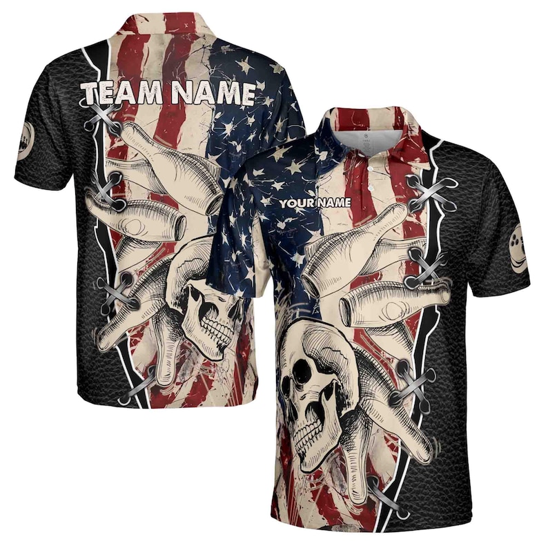 Customize Name Team Name Retro Skul American Flag Bowling Men’s Polo Shirt